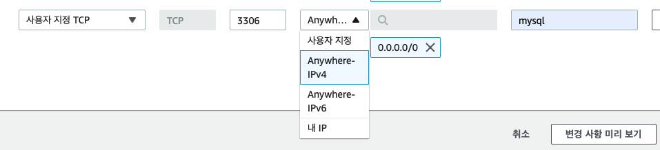 14.포트, anywhere-IPv4, 0.0.0.0/0, 설명란 설정