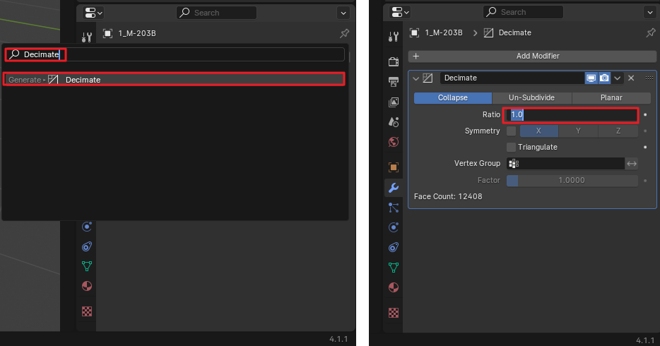모델링에 Decimate를 Modifier에서 추가한 후