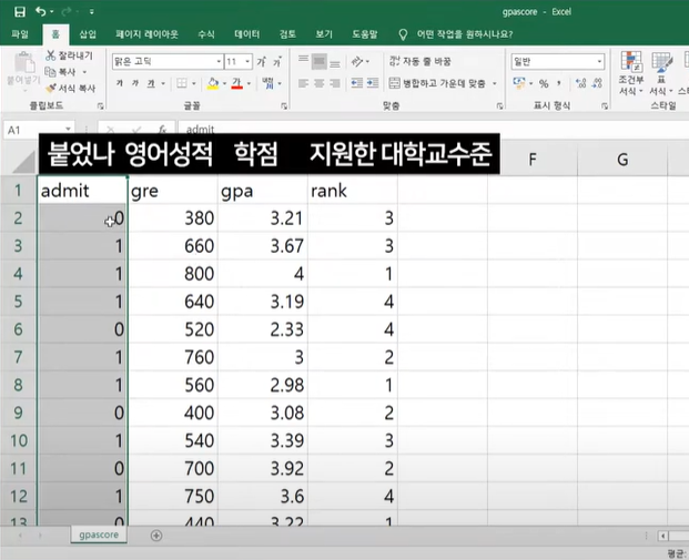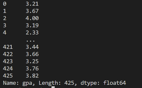 예를들어 gpa 열의 데이터들만 보고싶다면 아래와같이 작성하면된다