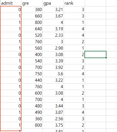 gre gpa rank 데이터를 주면 admit(합격여부)을 확률로 예측하는 딥러닝 모델을 만들어 보자