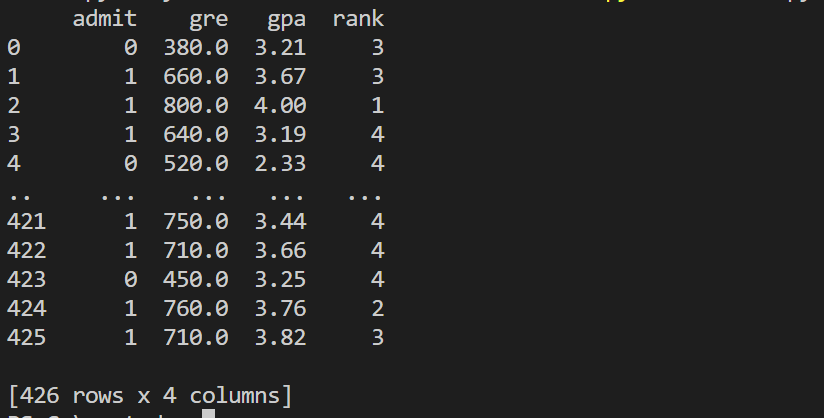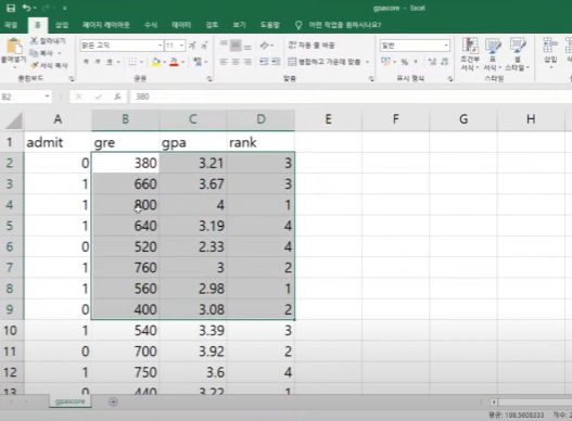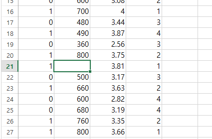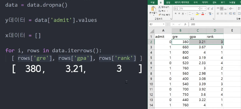 x데이터.append([rows['gre'],rows['gpa'],rows['rank']])