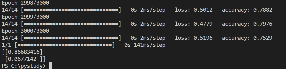 model.fit(np.array(x데이터), np.array(y데이터), epochs = 3000)