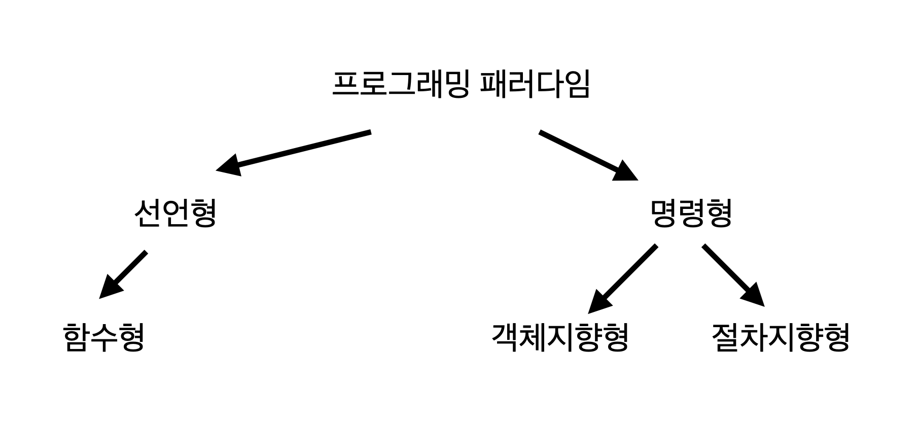 프로그래밍 패러다임은 크게 선언형, 명령형으로 나누며, 선언형은 함수형이라는 하위 집합을 갖는다. 또한, 명령형은 다시 객체지향, 절차지향으로 나눈다.