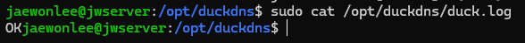 설정이 완료되면 /opt/duckdns.duck.log 파일에서 로그를 확인하여 IP 주소가 성공적으로 업데이트 되었는지 확인할 수 있습니다.
