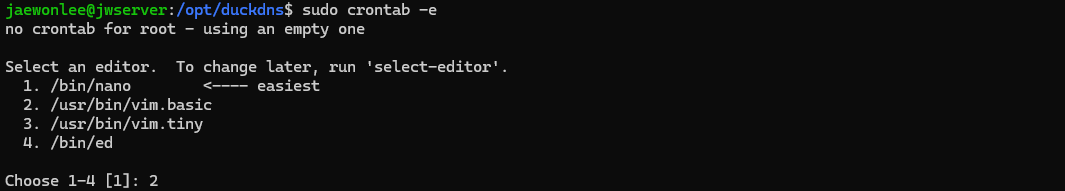 DuckDNS는 동정 IP를 사용할 경우 IP 주소를 주기적으로 업데이트해야하므로, cron job을 설정하여 스크립트를 자동으로 실행하게 만듭니다.