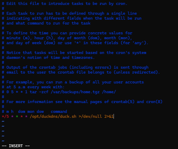 */5 * * * * /opt/duckdns/duck.sh >/dev/null 2>&1