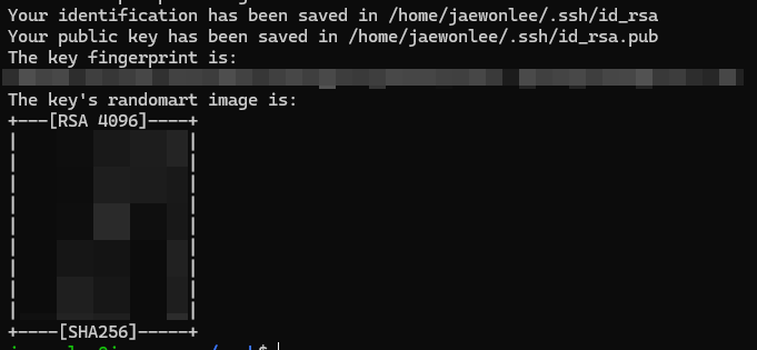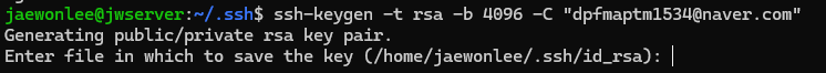 만약 enter를 하게되면 /home/유저명/.ssh/id_rsa 위치에 id_rsa(private key), id_rsa.pub(public key) 가 생성이 됩니다.