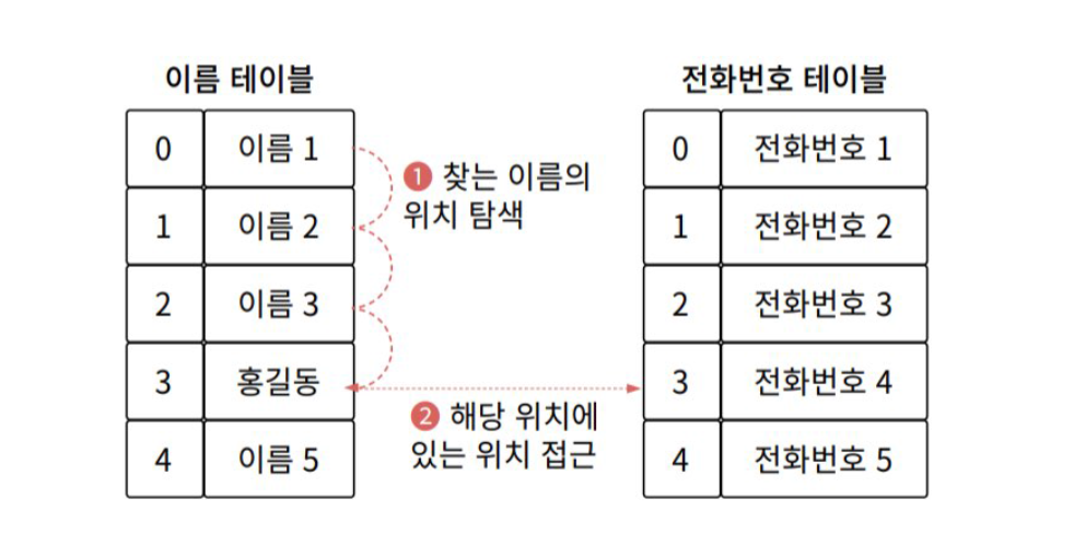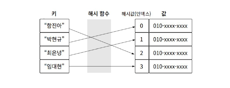 사실 우리 생활에도 해시를 많이 활용합니다. 가장 수비게 볼 수 있는 해시의 예는 연락처입니다. 연락처는 다음과 같은 그림으로 그려볼 수 있습니다.