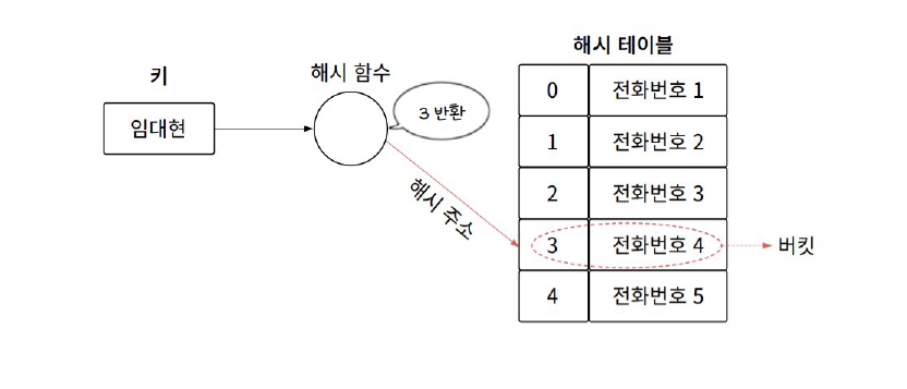 반면 해시를 사용하면, 순차 탐색할 필요 없이 해시 함수를 활용해서 특정 값이 있는 위치를 바로 찾을 수 있어 탐색 효율이 좋습니다. 그림에서 해시 테이블은 키와 대응한 값이 저장되어있는 공간이고, 해시 테이블의 각 데이터를 버킷이라고 부릅니다.