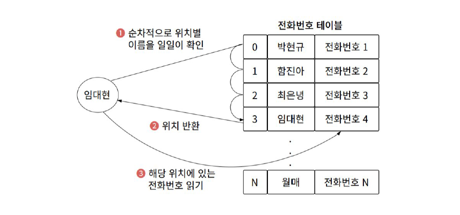 만약 해시를 사용하지 않는다면 우리는 값의 위치에 대한 어떤 정보도 알 수 없을 겁니다. 그래서 어떤 데이터를 찾으려면 전체 데이터를 확인해보는 방법밖에는 없을 겁니다. 예를 들면 다음과 같이 전체 전화번호를 순차 탐색해 이름에 맞는 전화번호를 찾아야 할 겁니다. 그림으로만 봐도 탐색 효율이 떨어집니다.