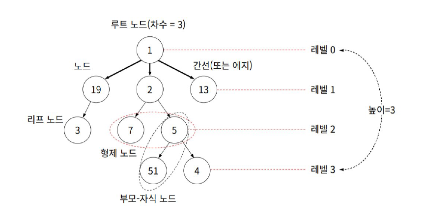 노드와 노드 사이에는 이어주는 선이 있습니다. 이를 간선 또는 엣지(edge)라고 합니다. 트리는 노드와 노드가 단방향 간선으로 연결되어 있고, 루트 노드에서 각 노드까지 경로는 유일합니다. 루트 노드로부터 특정 노드까지 거쳐가는 최소한의 간선 수를 레벨로 표현합니다. 예를 들어 루트 노드는 레벨 0, 노드 19, 2, 13은 레벨 1입니다.