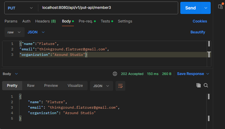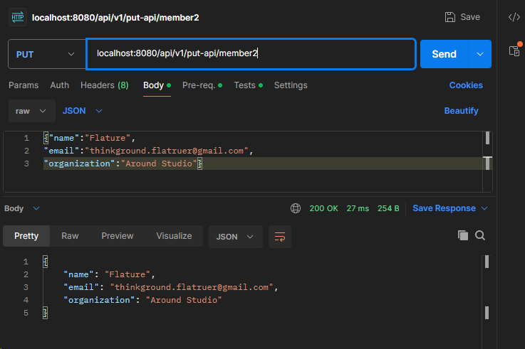PUT API는 POST 메서드와 마찬가지로 값을 HTTP Body에 담아 전달합니다. 서버에서는 이 값을 받기 위해 아래 예제와 같이 @RequestBody를 사용합니다