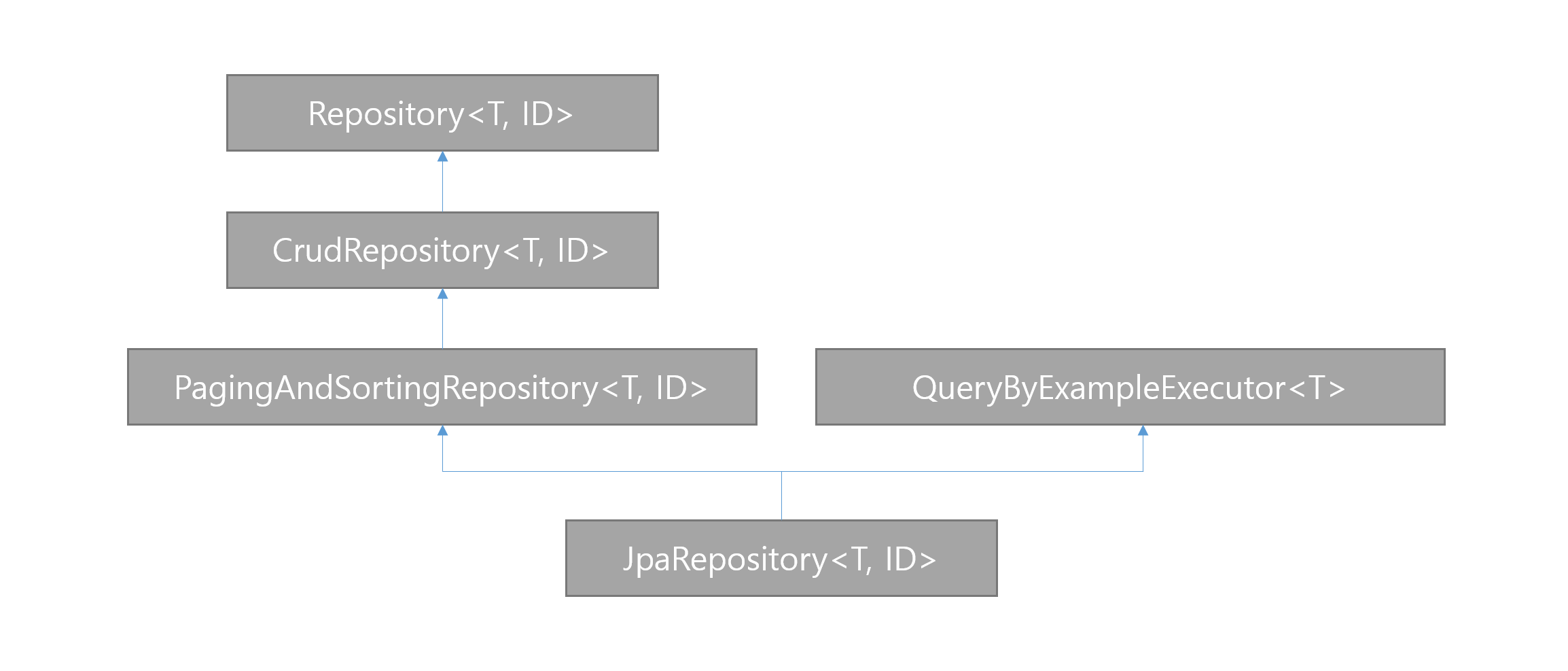 public interface JpaRepository<T, ID> extends PagingAndSortingRepository<T, ID>,QueryByExampleExecutor<T> {
