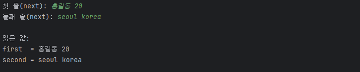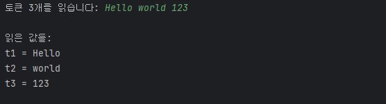 - 공백(스페이스/탭/개행)을 기준으로 다음 토큰 하나만 읽습니다.