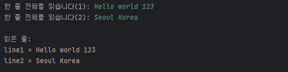 - 개행문자(엔터)를 만날 때까지 한 줄 전체를 통째로 읽습니다.