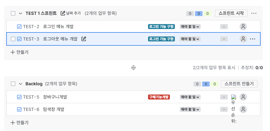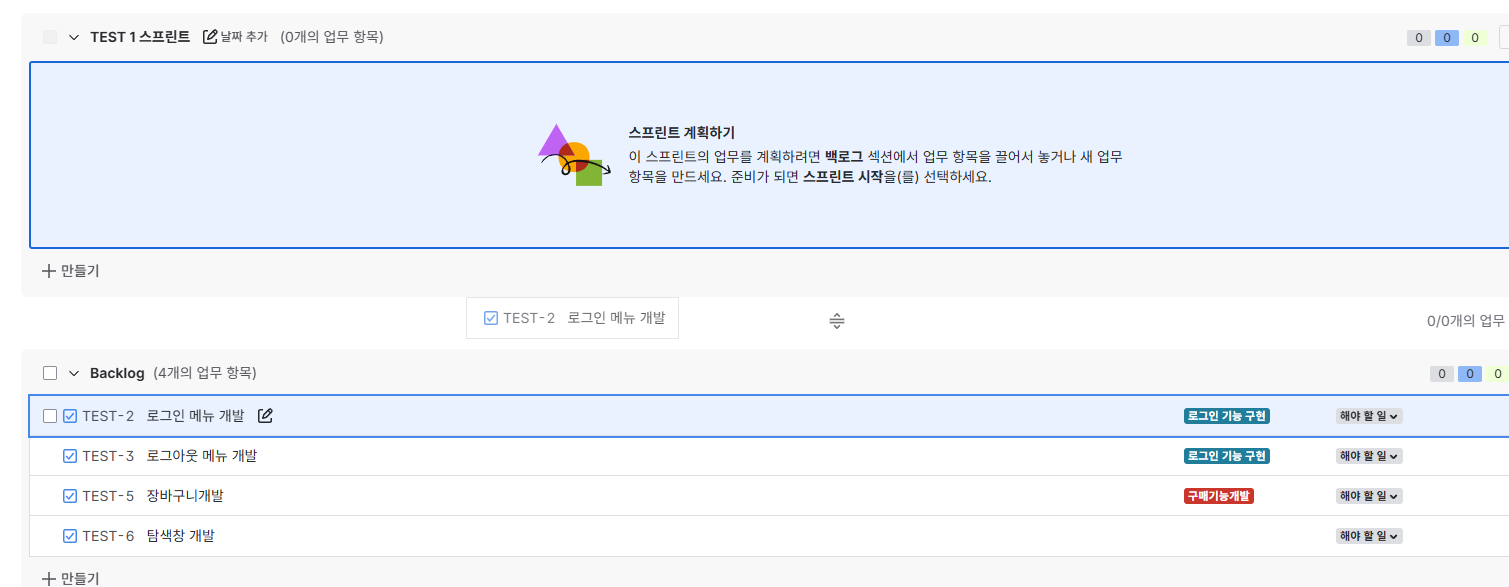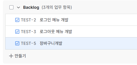3. 백로그 - 작업생성 (ex: 로그인 메뉴 개발, 로그아웃 메뉴 개발, 장바구니 개발)
