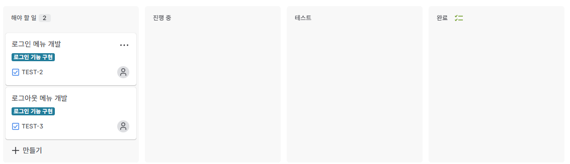 - In Test (테스트 중): ⭐️실무 꿀팁⭐️ 개발을 끝냈다고 바로 완료가 아닙니다. 프론트엔드나 기획자가 "버그 없나?" 하고 테스트하는 대기 칸입니다.
