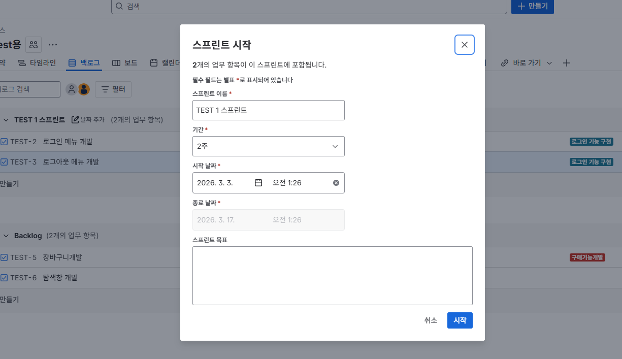 - 창고(백로그)에 있는 100개의 티켓 중, "이번 주(스프린트)에는 딱 요 5개만 빼서 무조건 완성하자!"라고 합의한 뒤 '스프린트 시작' 버튼을 누릅니다.