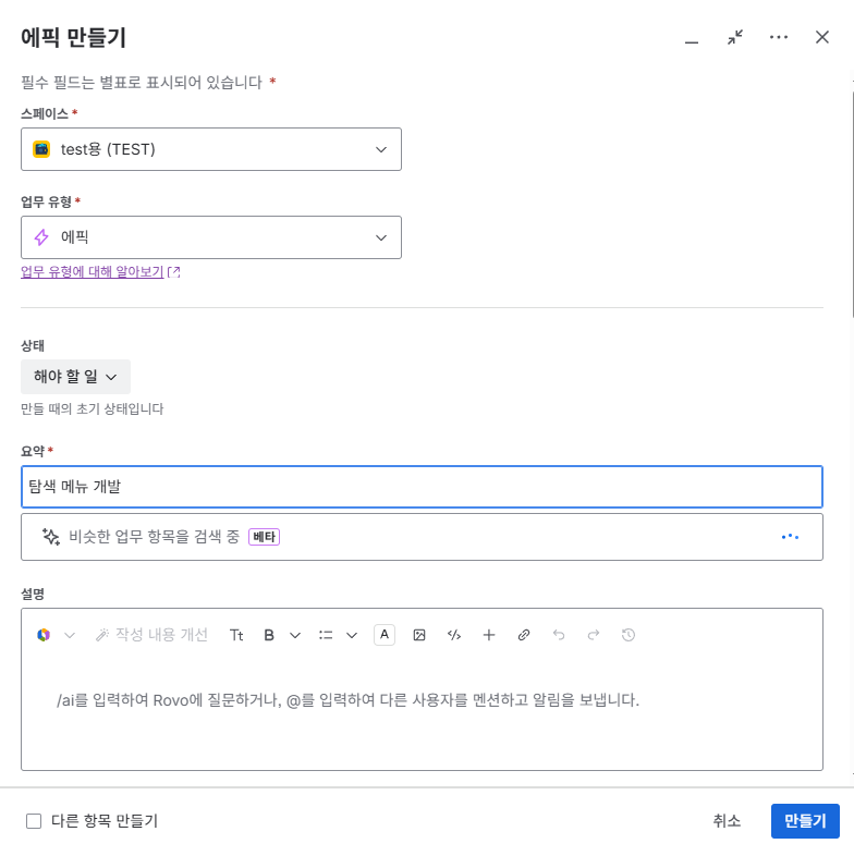 2. 에픽 생성 (ex: 회원가입 시스템 개발/ 상품구매 시스템 개발/ 탐색 메뉴 개발 / 운영 어드민 개발)