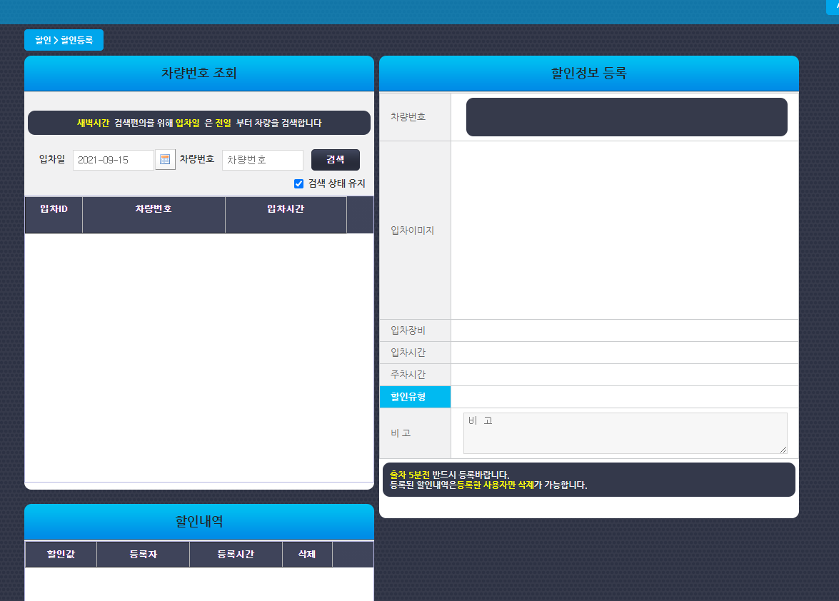 차량번호를 검색해서 오른쪽 하단에 파란색 버튼들을 눌러 감면하는 방식이었다