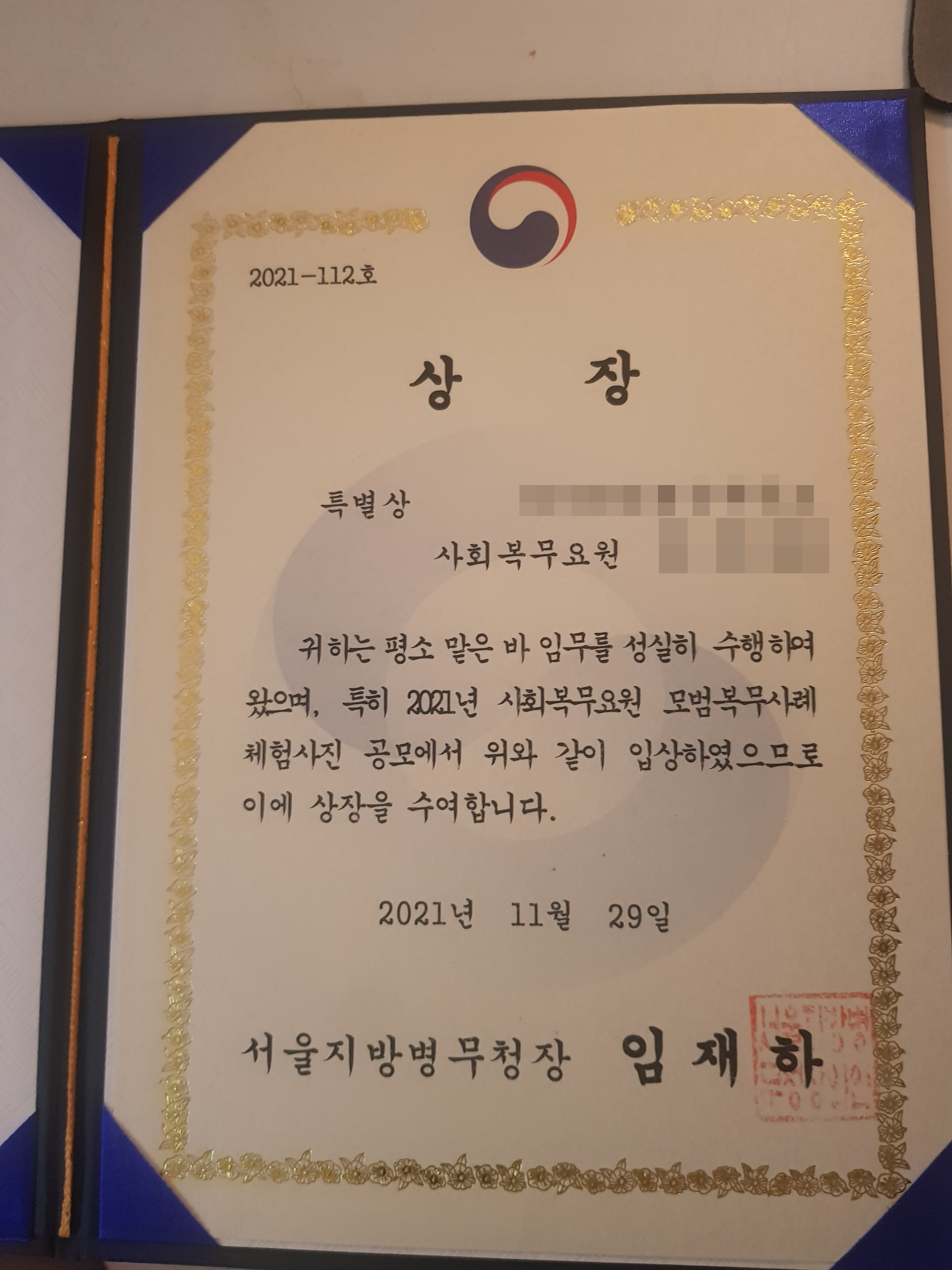 + 키오스크를 만들고 사진찍어서 사회복무요원 체험수기 및 사진공모전에 공모를 했는데 특별상을 수상했다