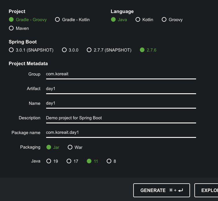 그래서 스프링 프로젝트를 생성해주는 사이트가 있음