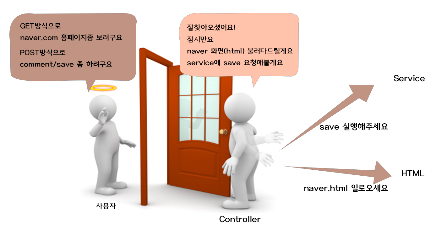 컨트롤러는 쉽게 회사 프론트데스크 같은 느낌이랄까... 징검다리역할