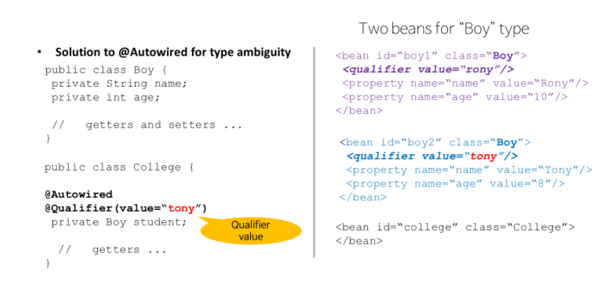이 경우 @Qualifier을 @Autowired와 함께 사용하여 정확히 어떤 bean을 사용할지 지정하여 특정 의존 객체를 주입할 수 있도록 합니다.